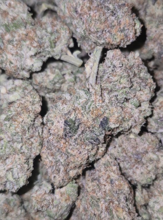Trichomes: Thick coating of milky-white trichomes giving the buds a sugary, frosted look